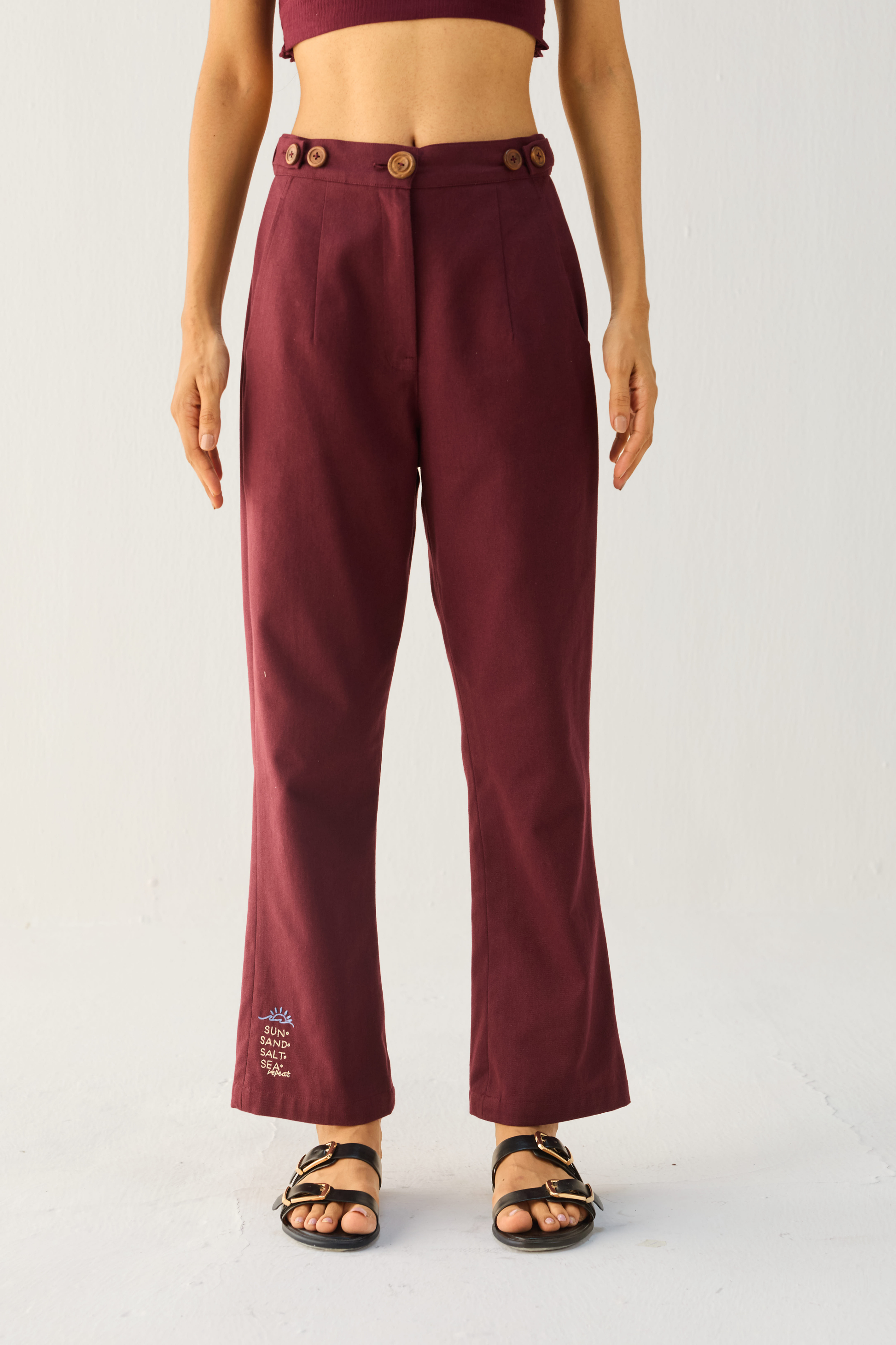 Fitted, straight-leg trousers that buttons at the waist, crafted in azo-free dyed organic cotton twill fabric, hand embroidered with shore-inspired and quote motifs.