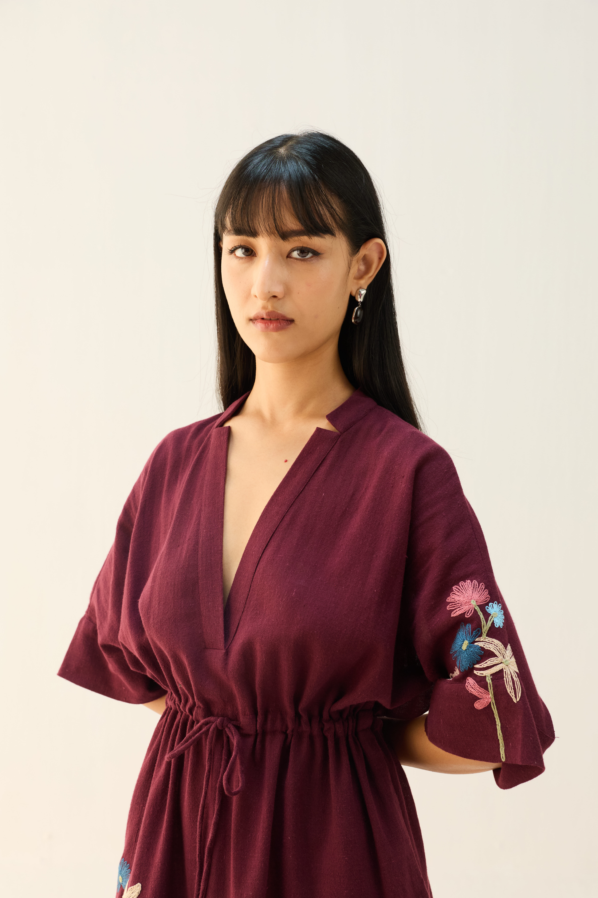 Relaxed fit, half-sleeve, v-neck dress with drawstring at the waist, crafted in azo-free dyed, handspun and handwoven organic cotton fabric, machine and hand embroidered with flower and quote motifs.