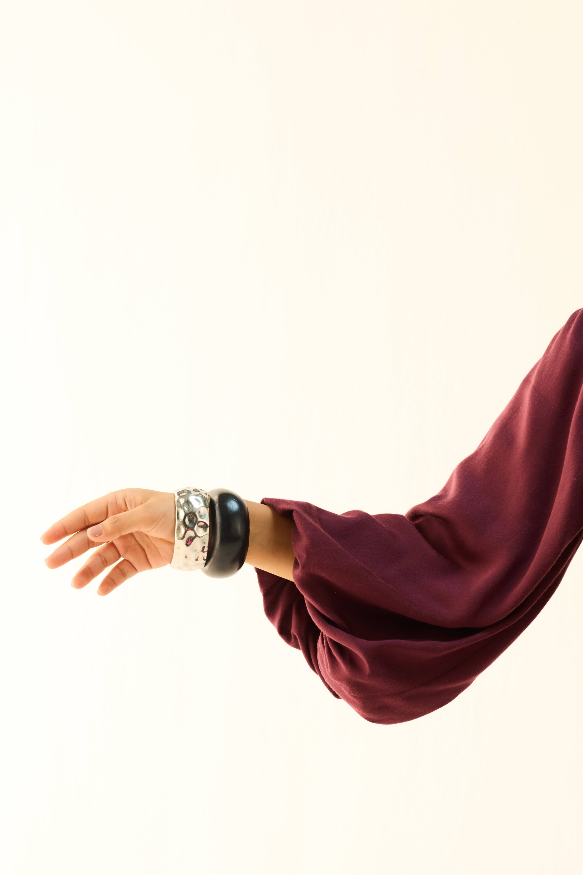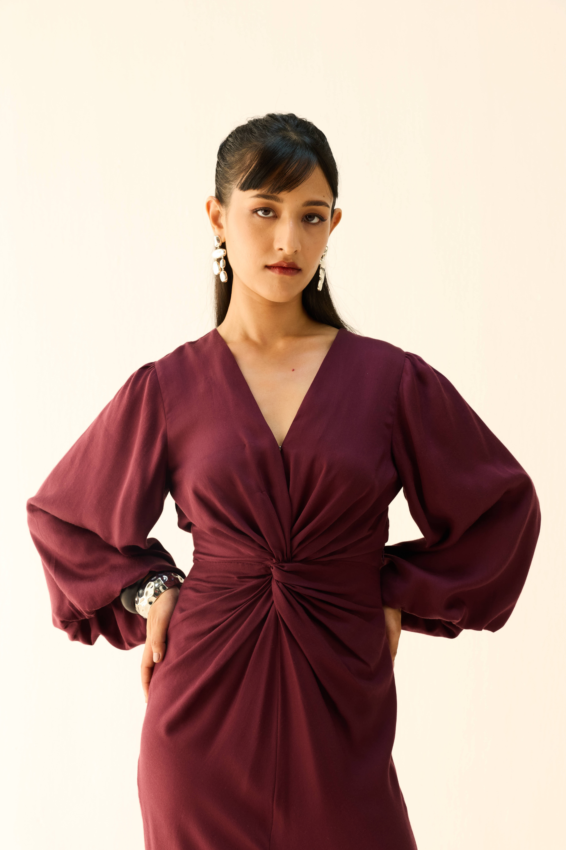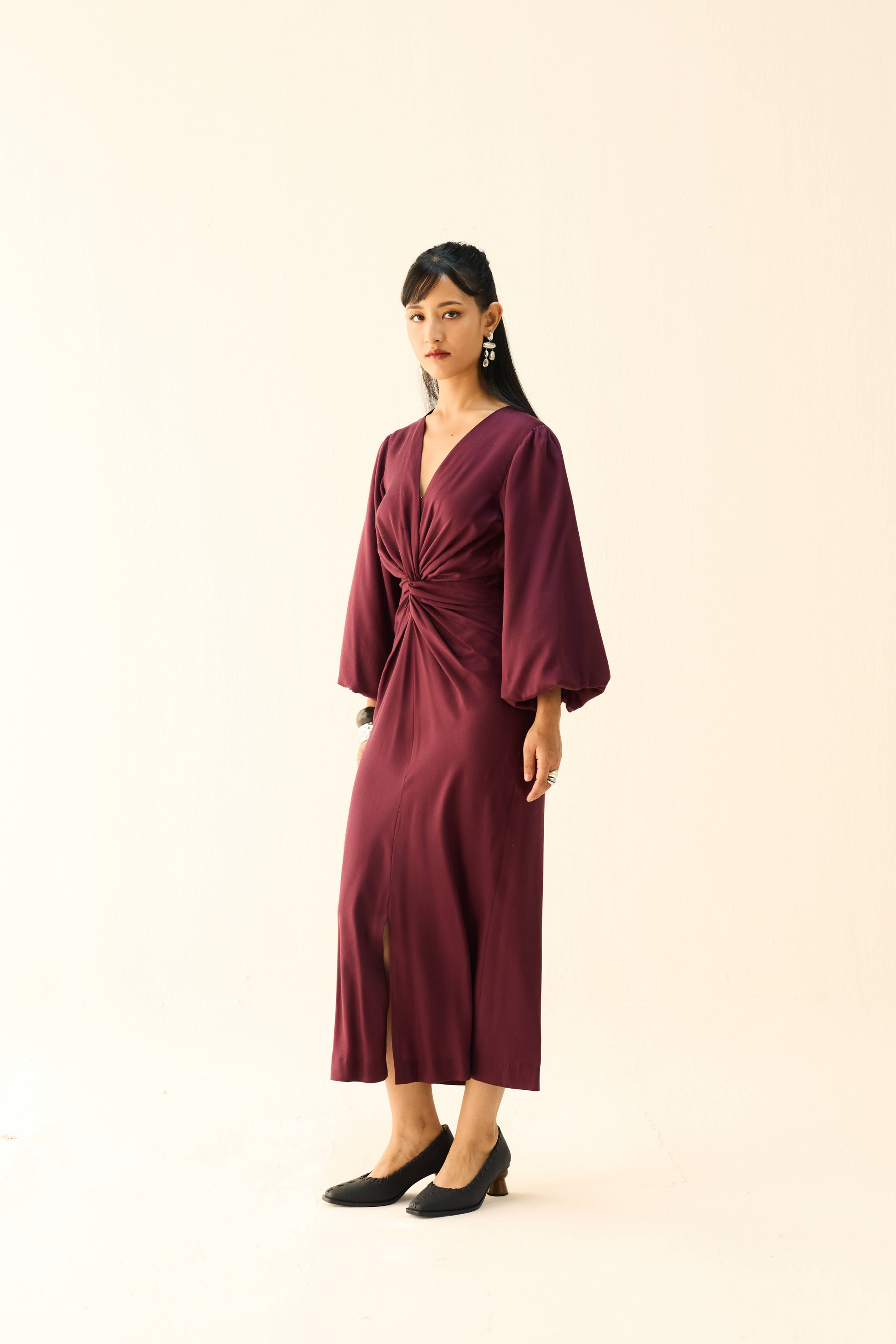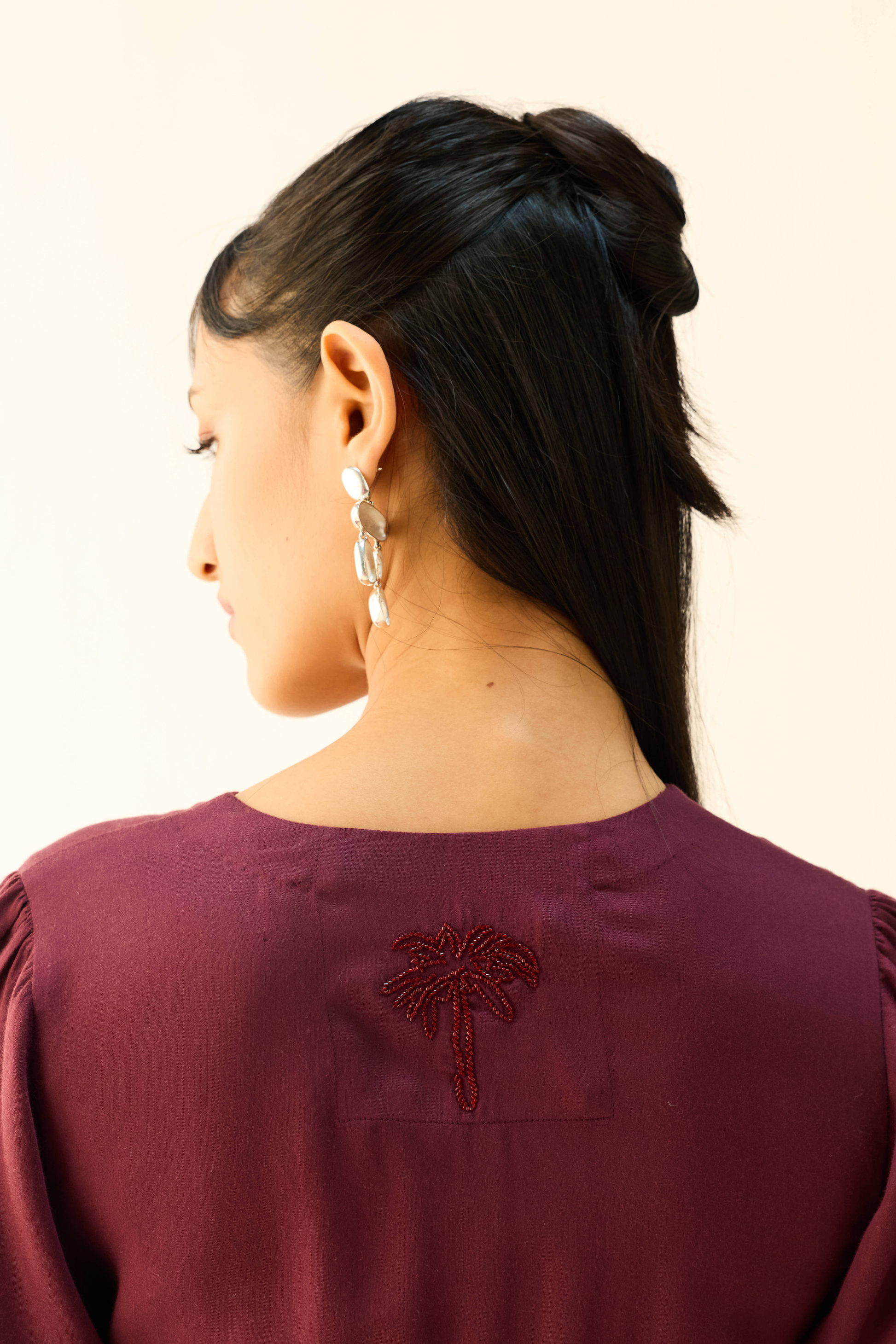 Fitted, v-neck, full puff sleeve, maxi dress, that gathers in the front, crafted in azo-free dyed Tencel fabric, hand embroidered with nature-inspired motifs.