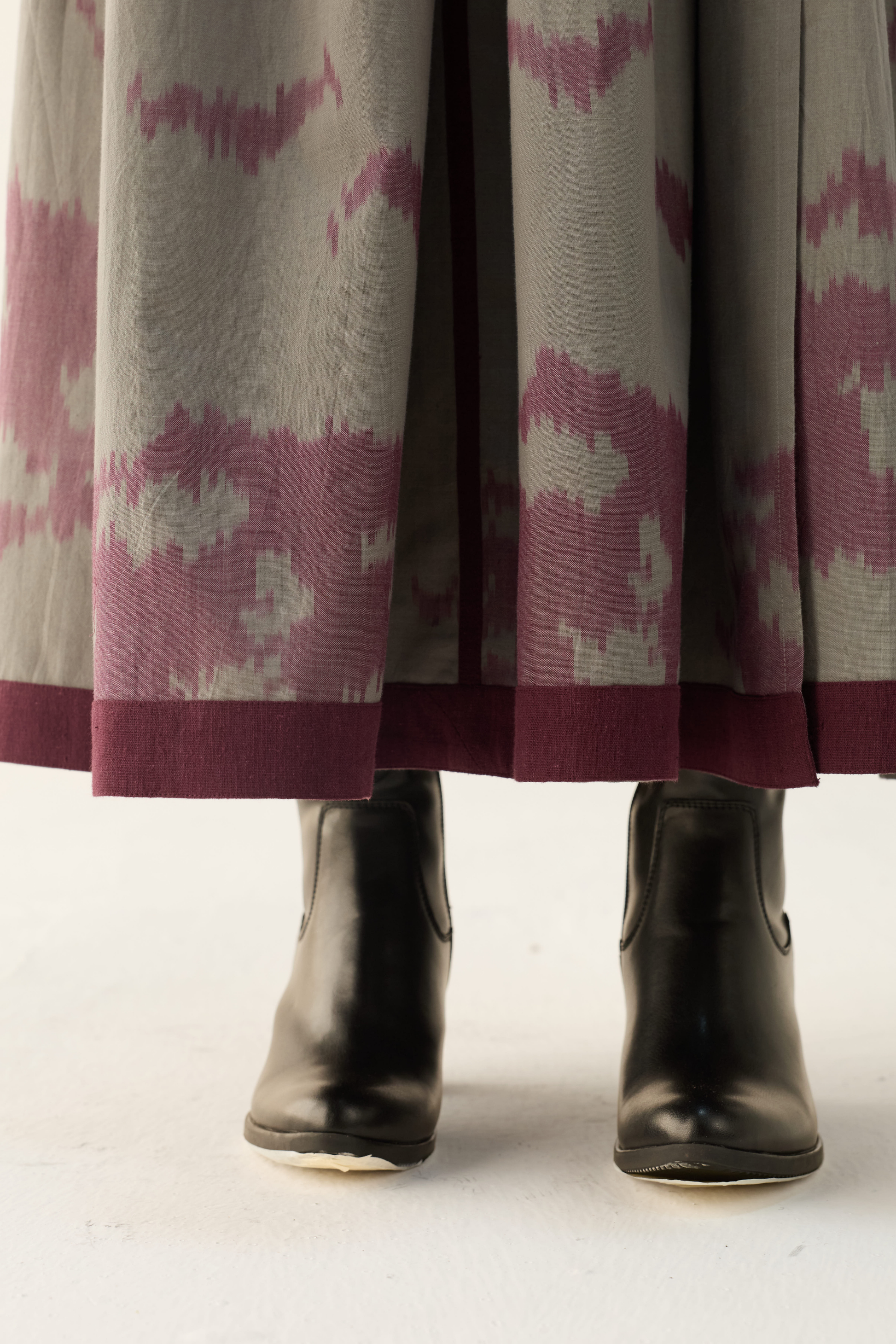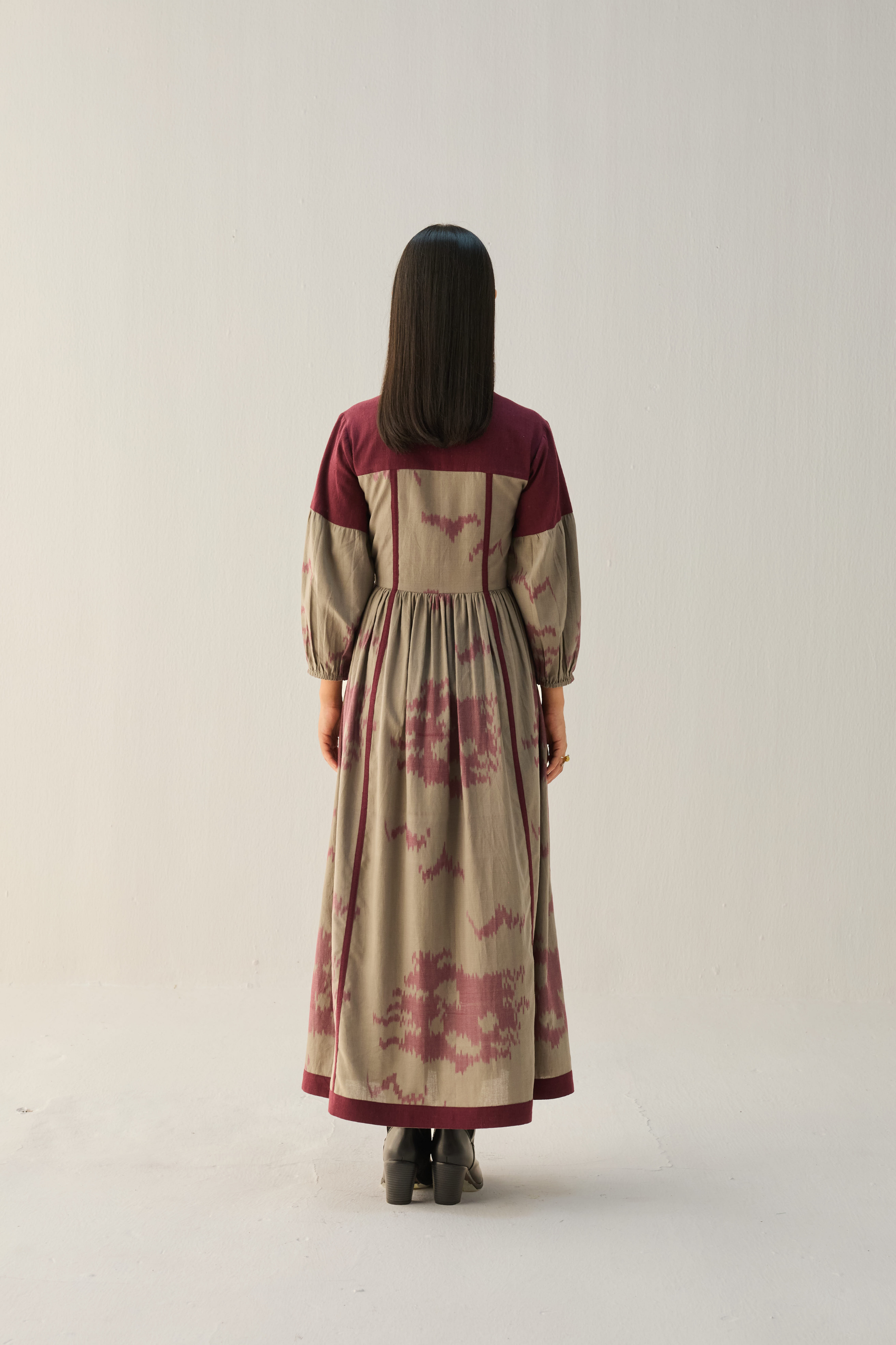 The pattern of this elegant dress is created using a slow craft method called ikkat. The term comes from the Malay-Indonesian word “mengikat”, meaning “to tie”, which describes how this fabric is resist-dyed in specific patterns before they are woven on the loom. When woven, these dyed threads align to form motifs.