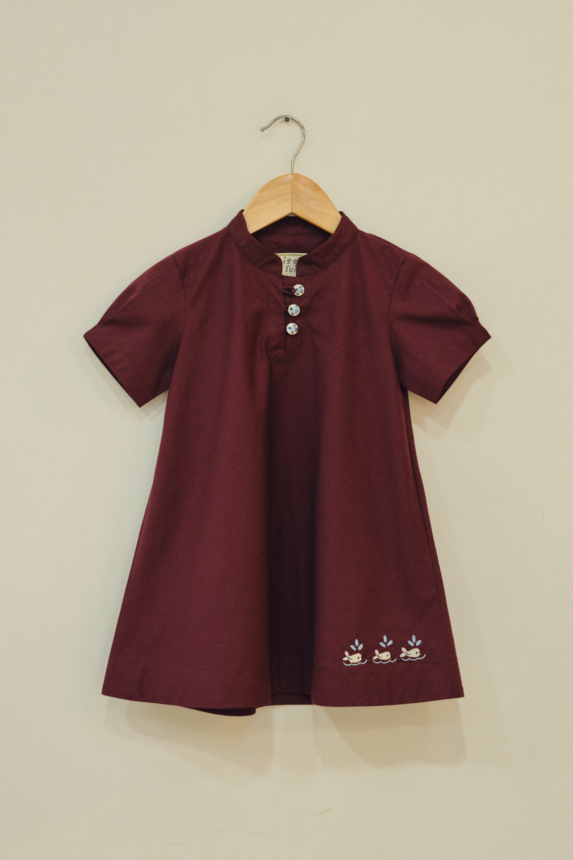 Regular fit, a-line, band collared, shortsleeve dress that fastens at the neck with buttons, crafted in azo-free dyed organic cotton poplin fabric, hand embroidered with a fish motifs. Sweet and stylish, this dress is an easy go-to for those days where you might need to pick something out quick but still feel comfy - made in quality, slow crafted, safe fabric.