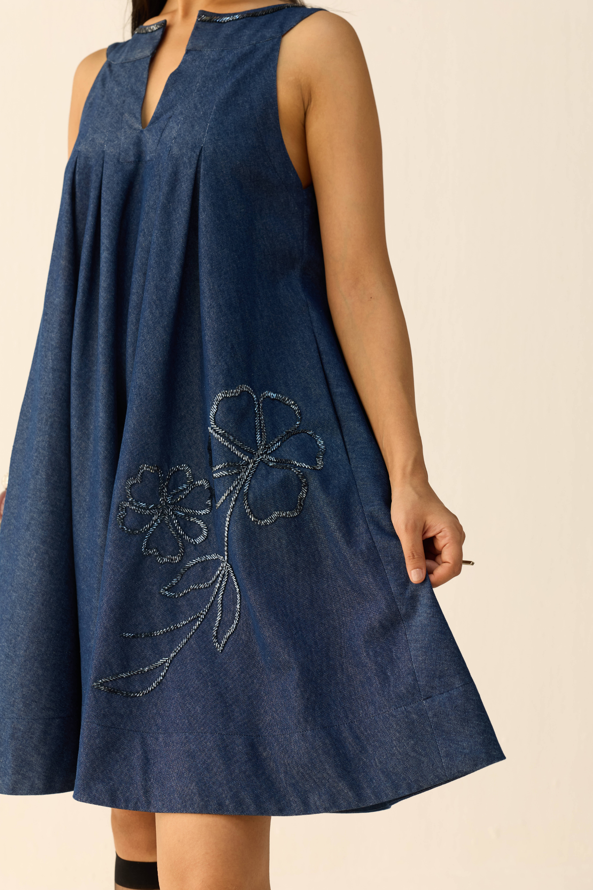Relaxed fit, deep split crew neck, sleeveless a-line dress crafted in sustainable organic cotton denim fabric, hand embroidered with flower motifs.
