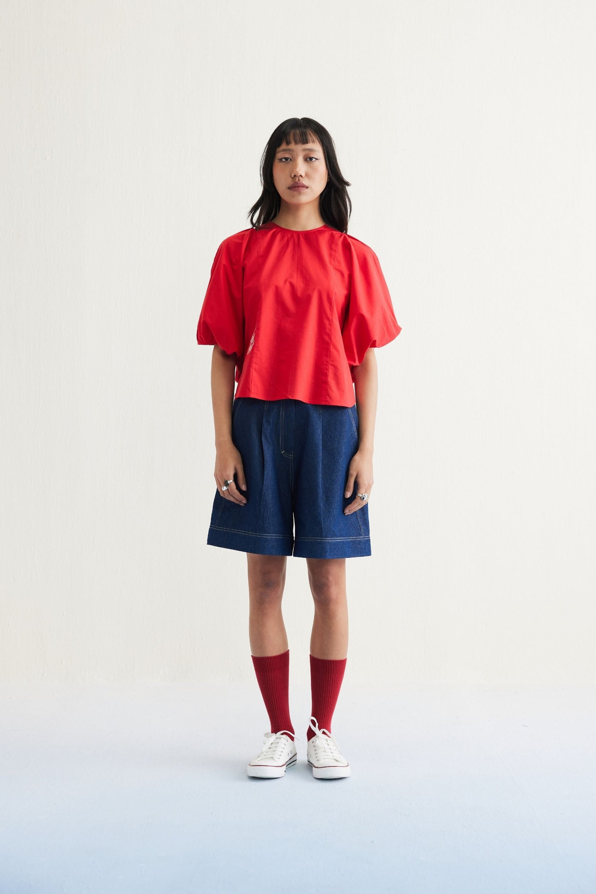 The top is crafted in azo-free dyed organic cotton poplin fabric, machine embroidered with ocean-inspired and message motifs, & the shorts are crafted in indigo dyed cotton denim fabric created with a blend of cotton and recycled cotton fibres, crocheted and hand embroidered with a crab and starfish motif.