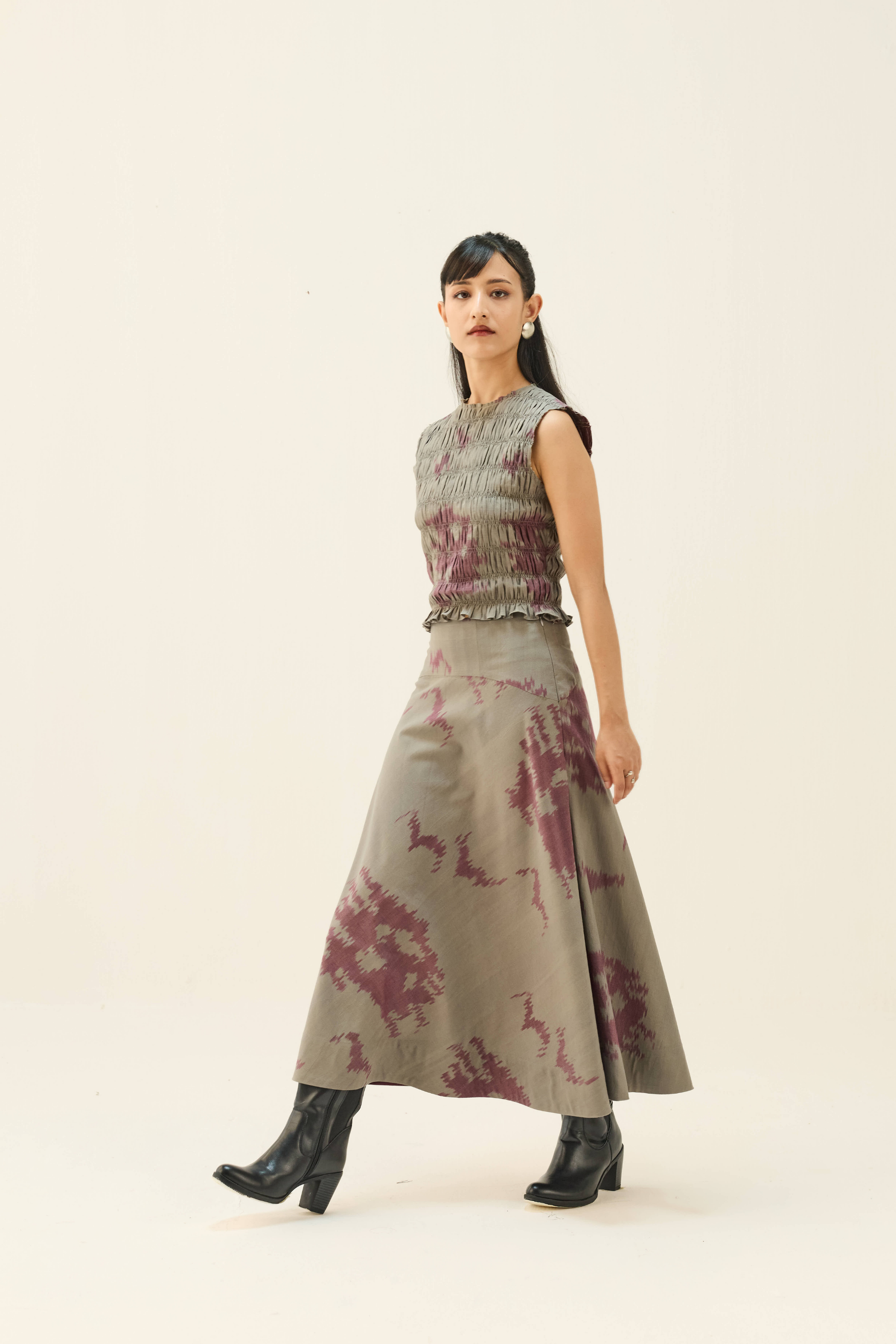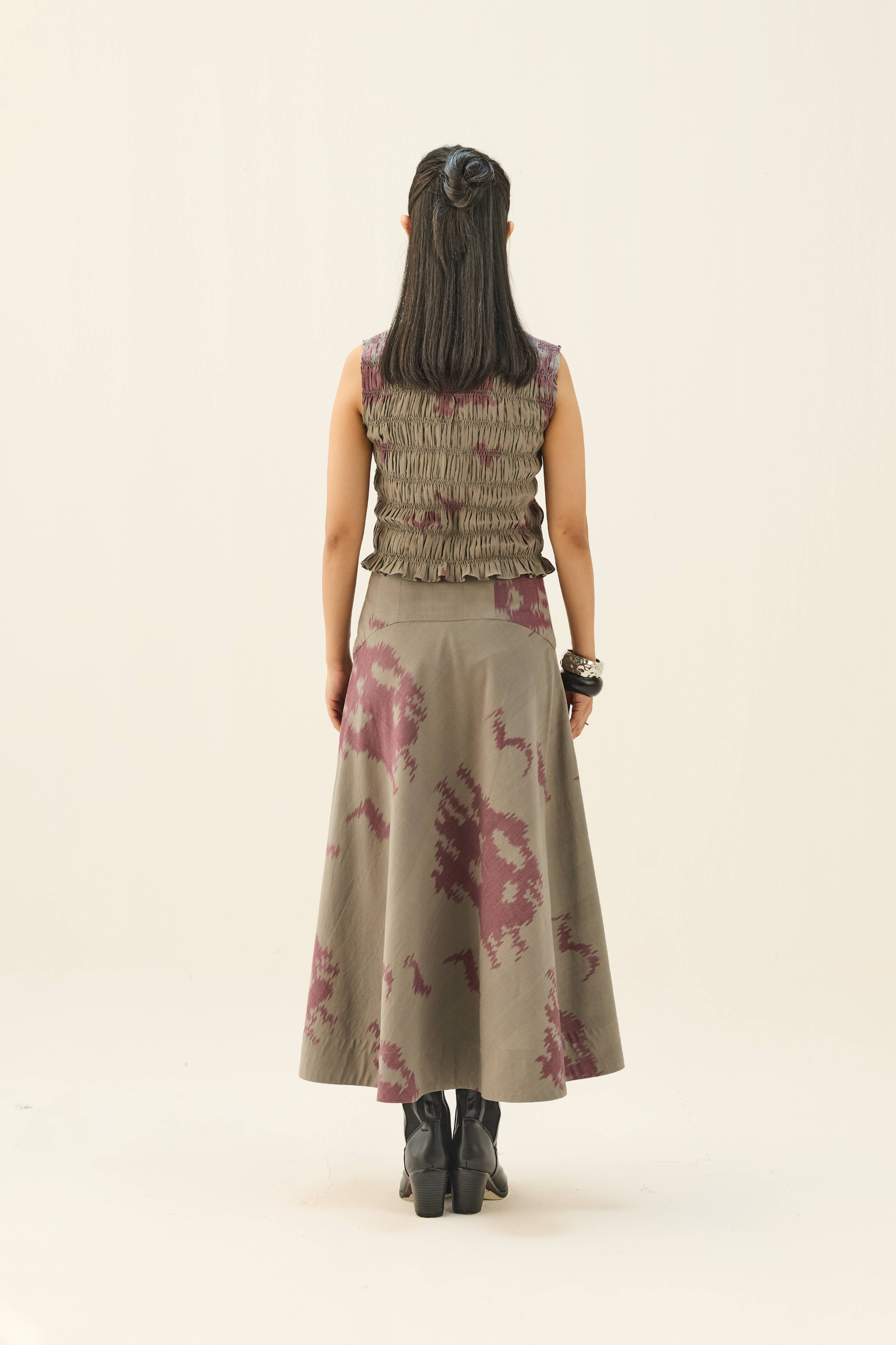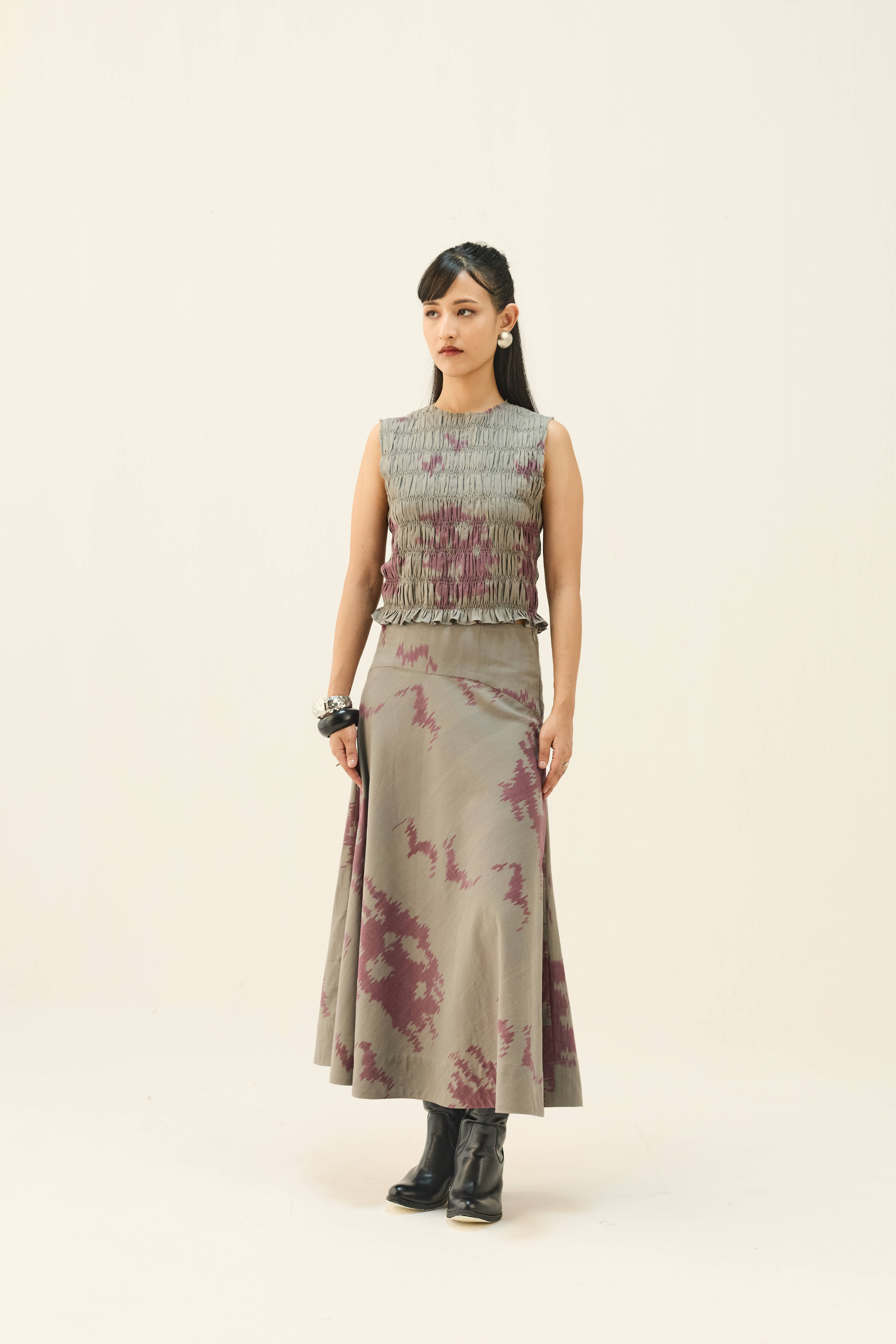 Fitted, sleeveless, round neck top that's smocked and fitted around the bodice, crafted in Ikat fabric, where the yarns are resist-dyed with azo-free dyes then handwoven to create its pattern.