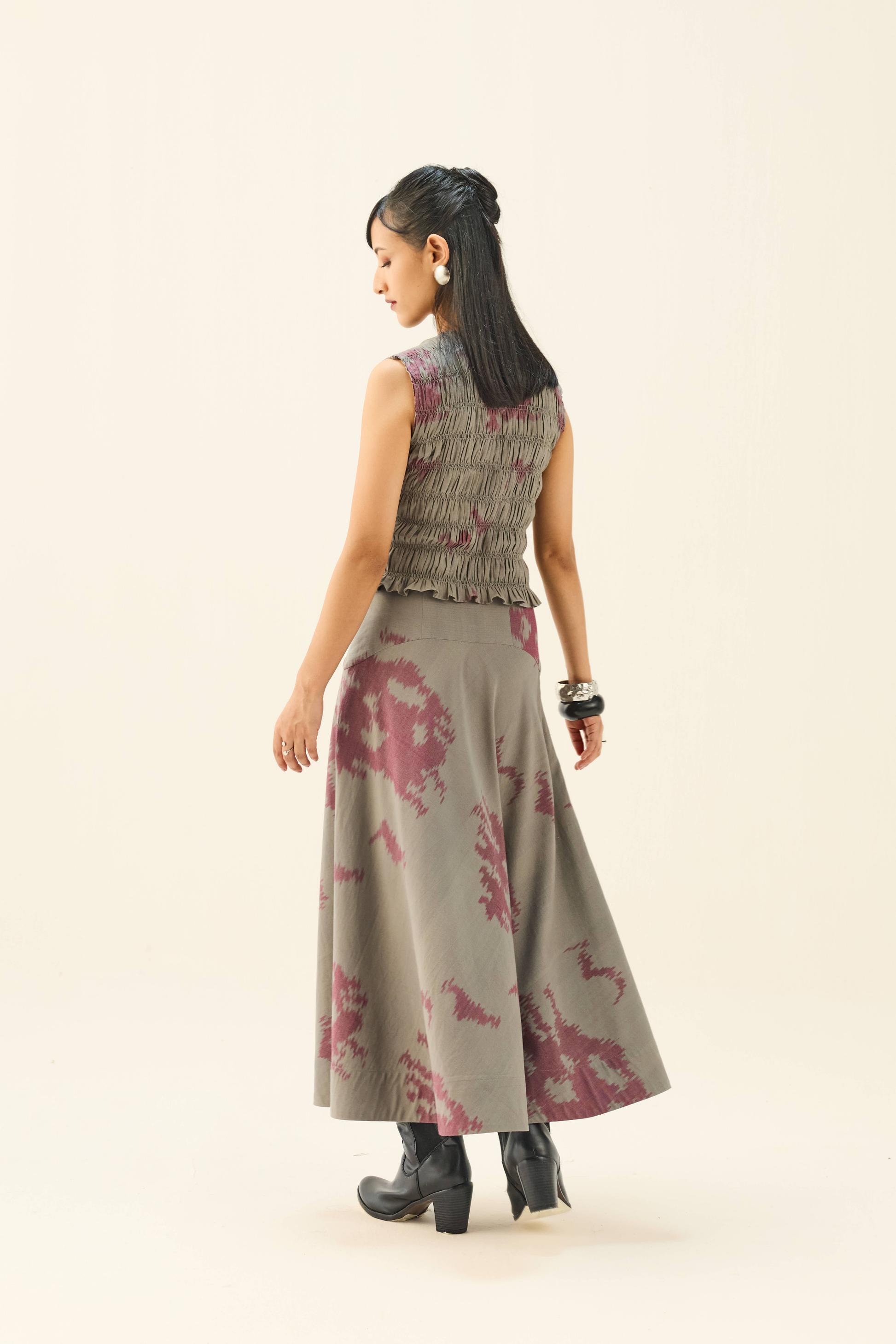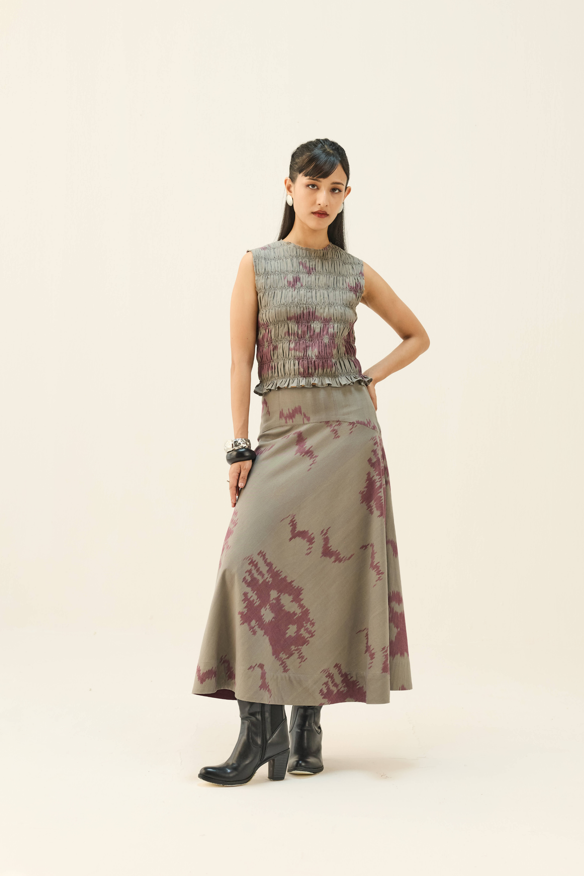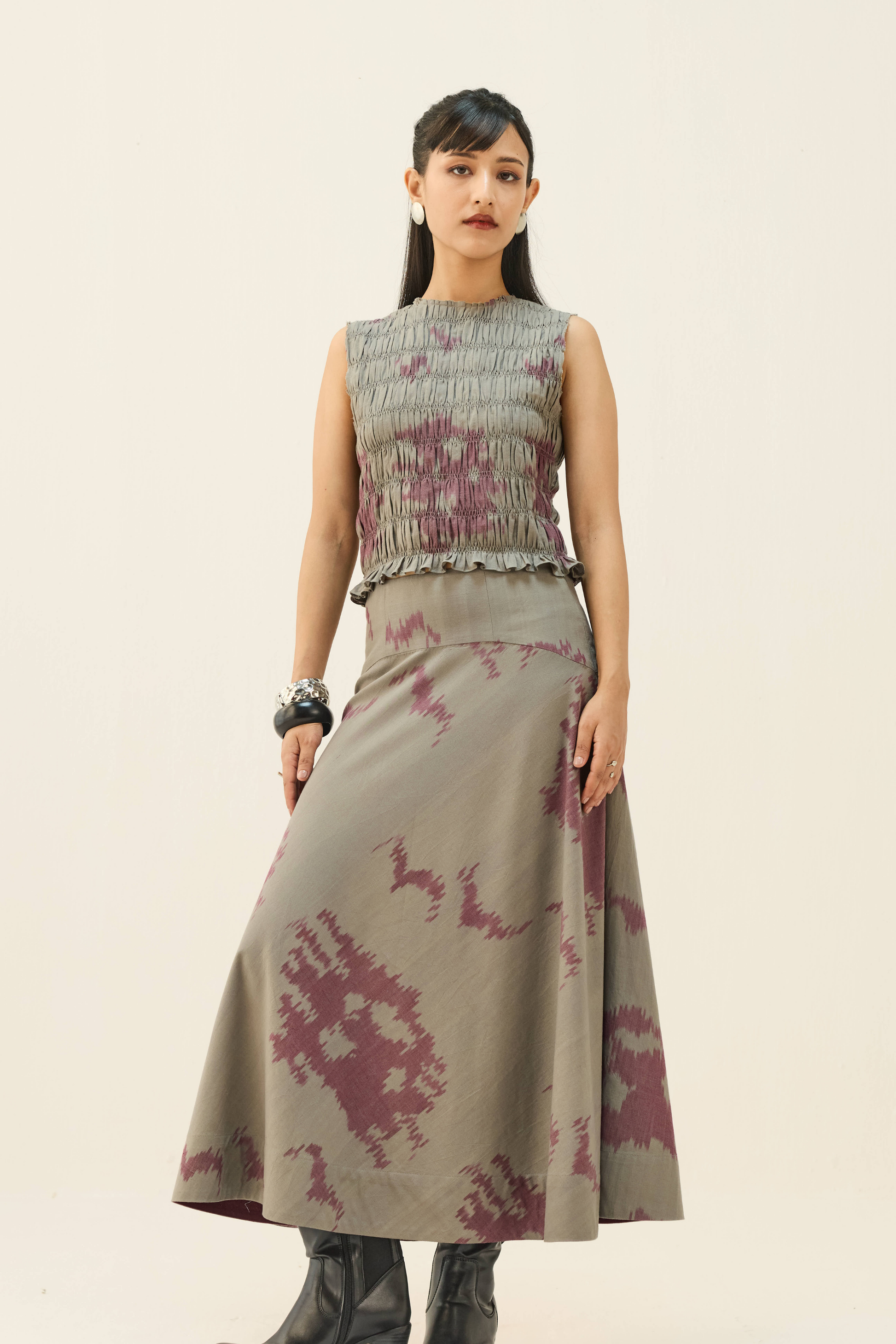 Fitted, sleeveless, round neck top that's smocked and fitted around the bodice, crafted in Ikat fabric, where the yarns are resist-dyed with azo-free dyes then handwoven to create its pattern.