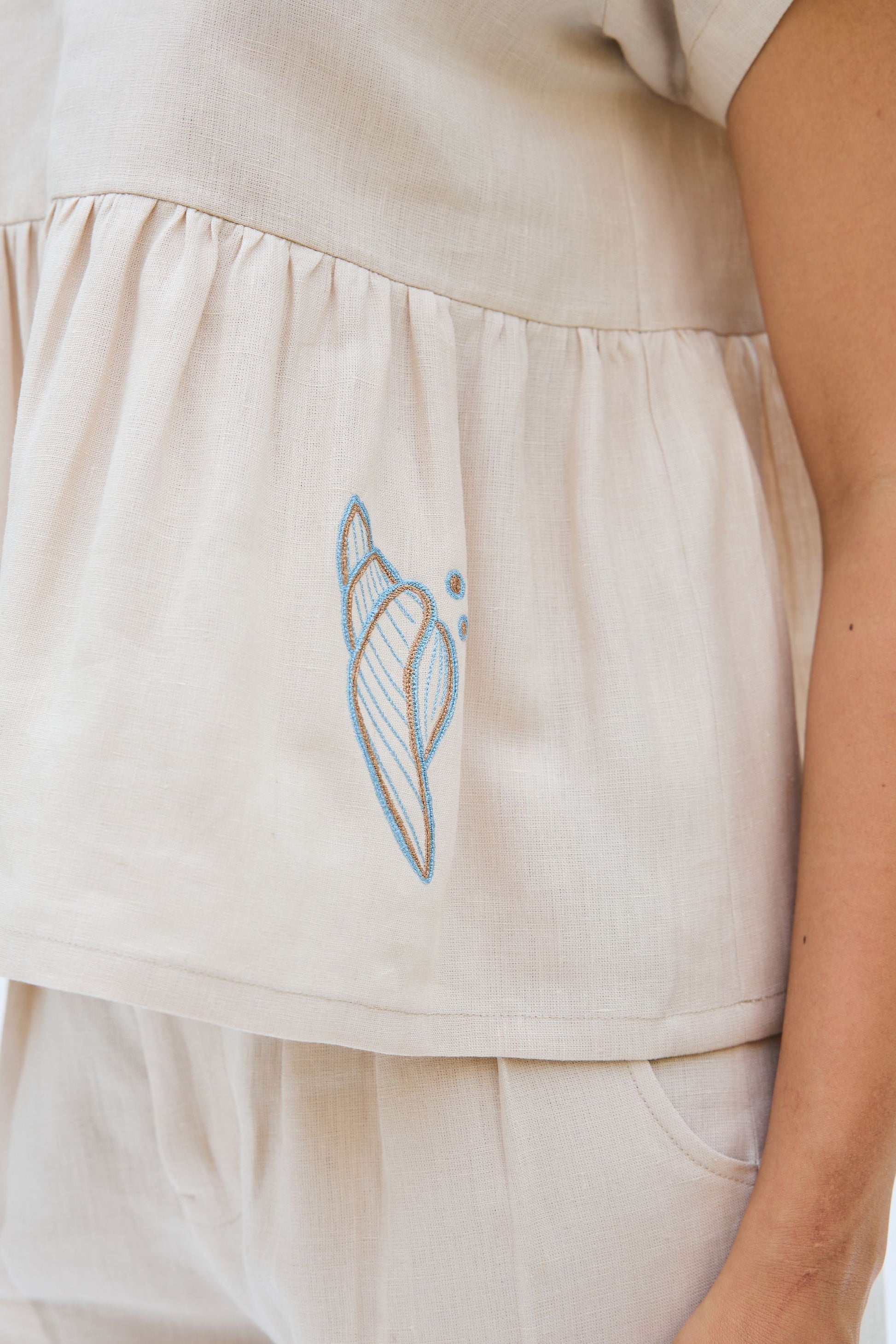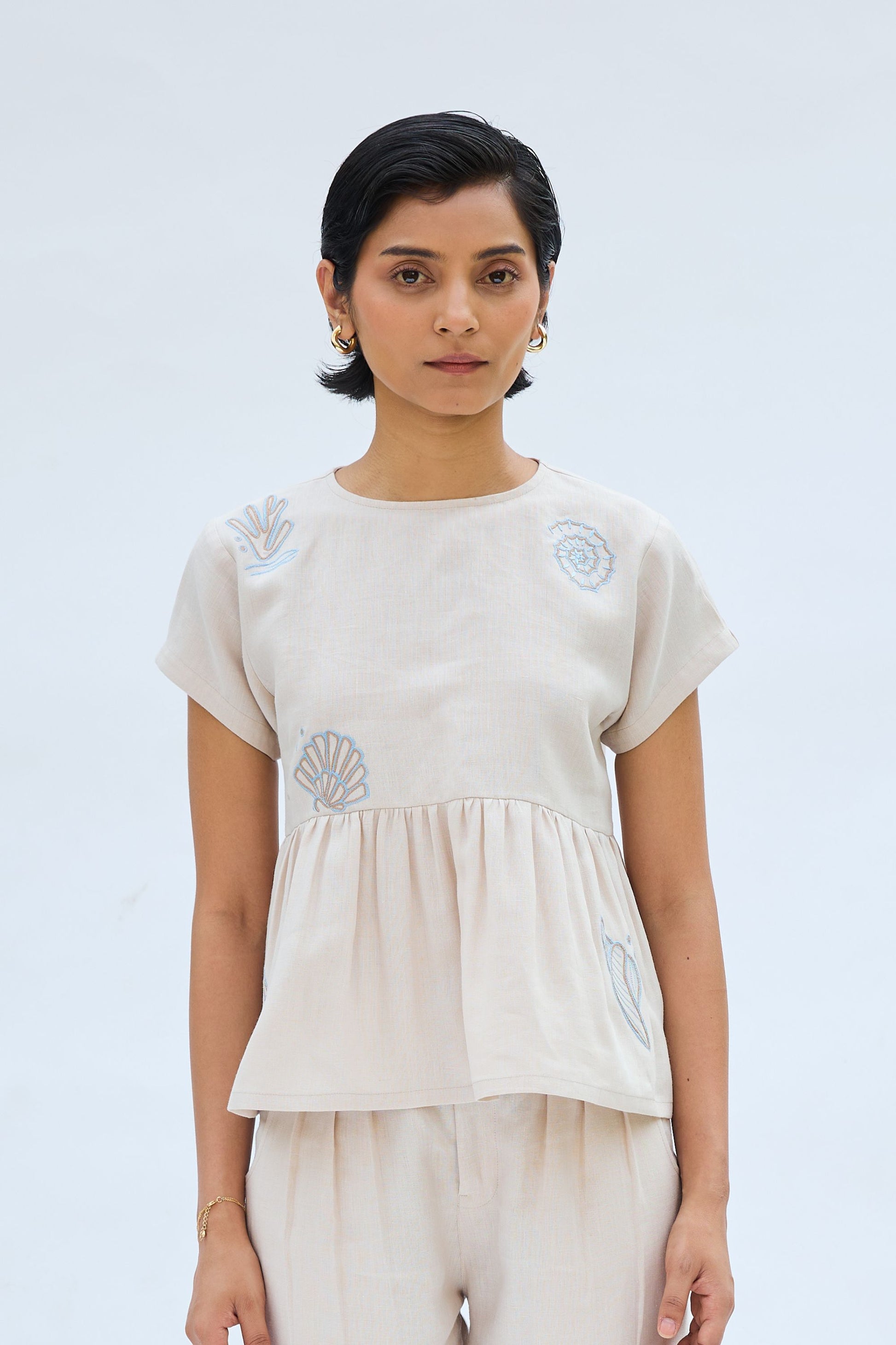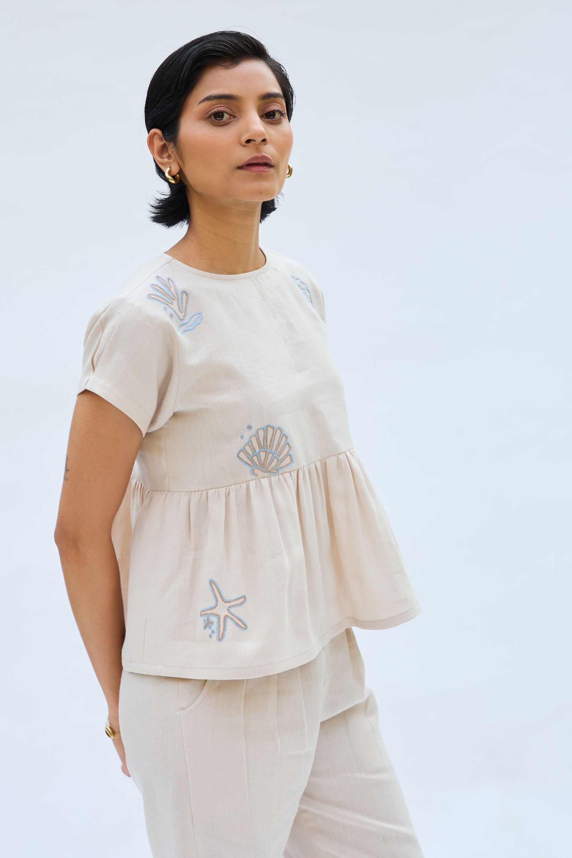 Regular fit, round-neck, sleeveless, peplum top crafted in azo-free dyed linen fabric, machine embroidered with ocean-inspired motifs.