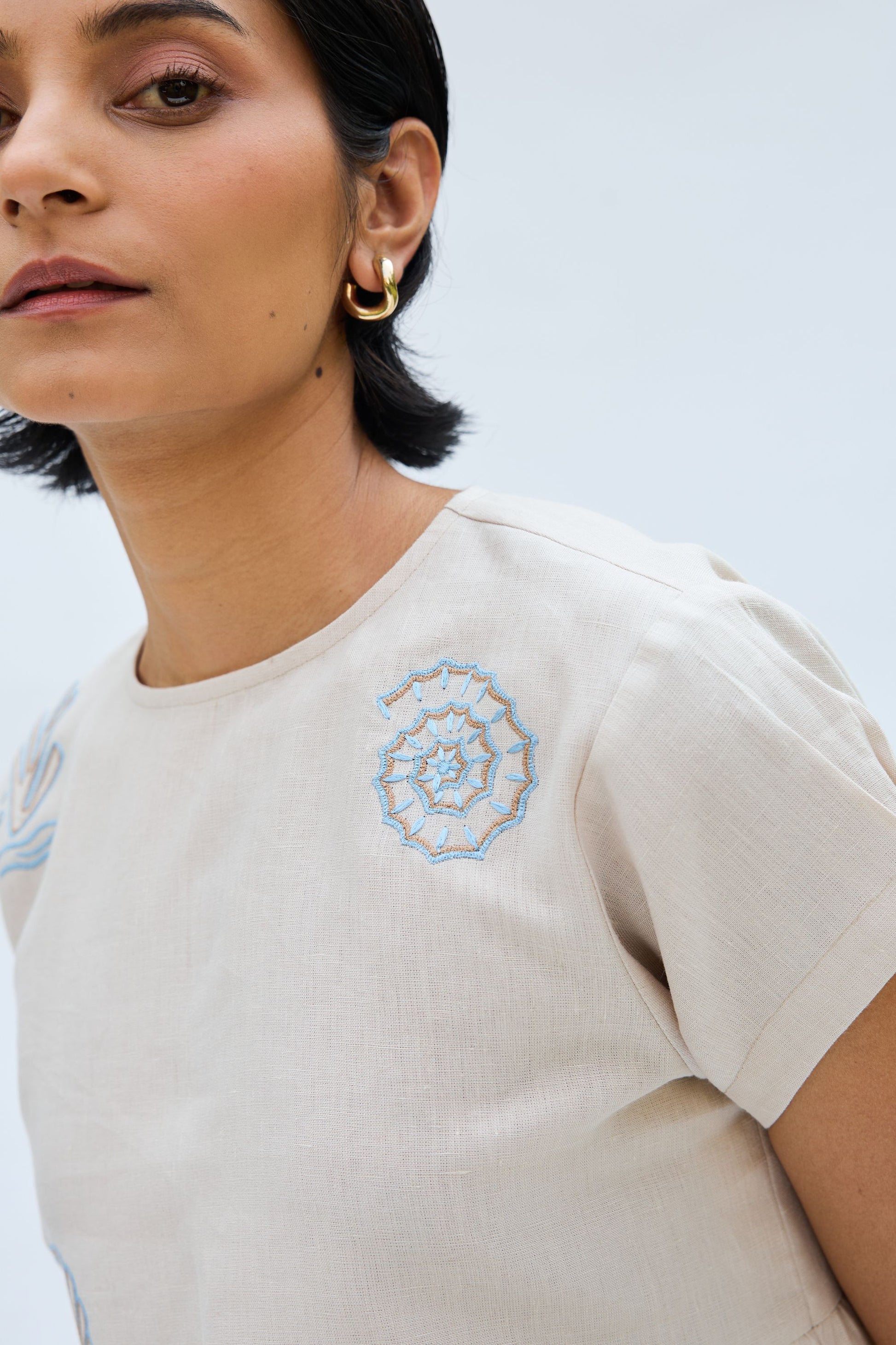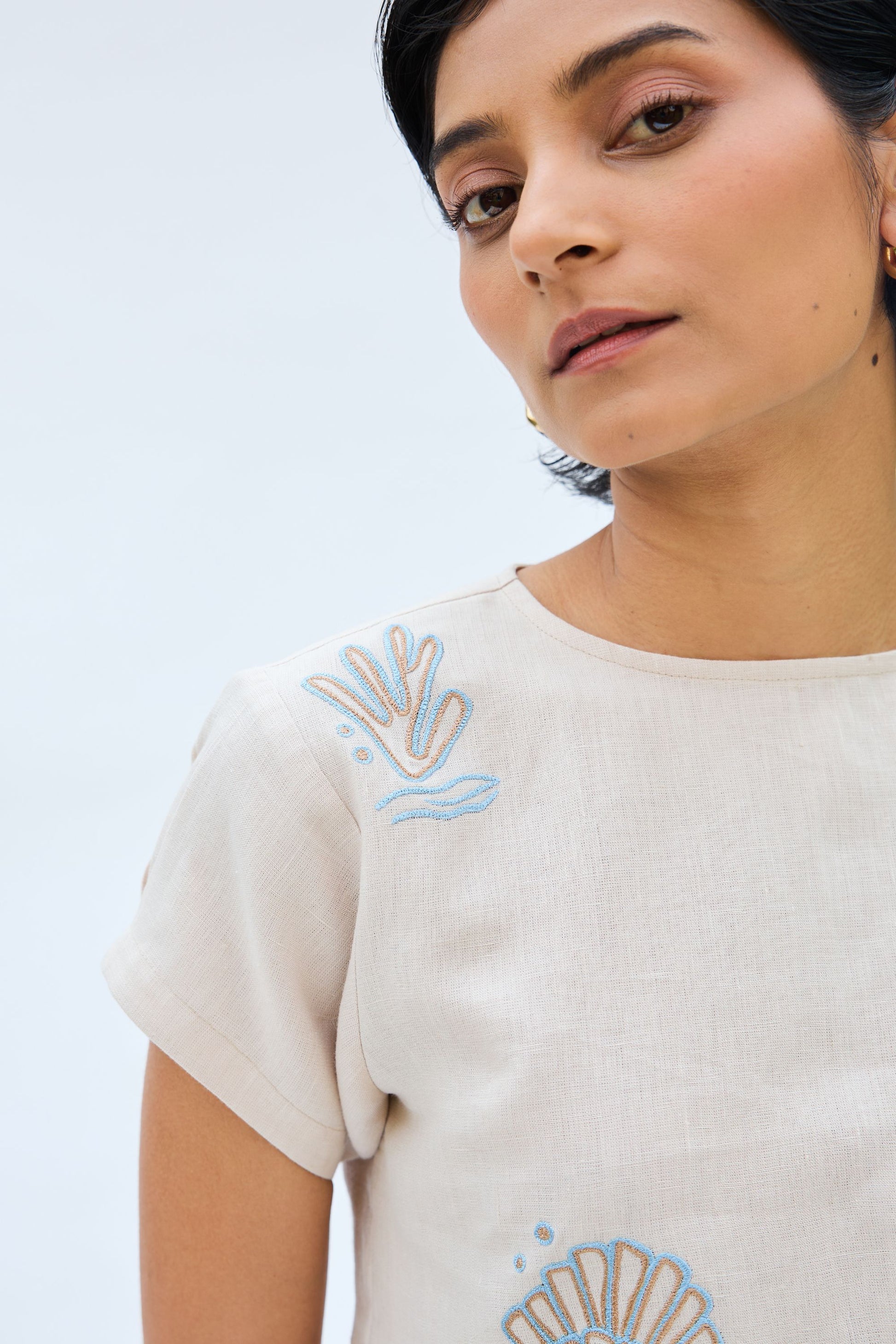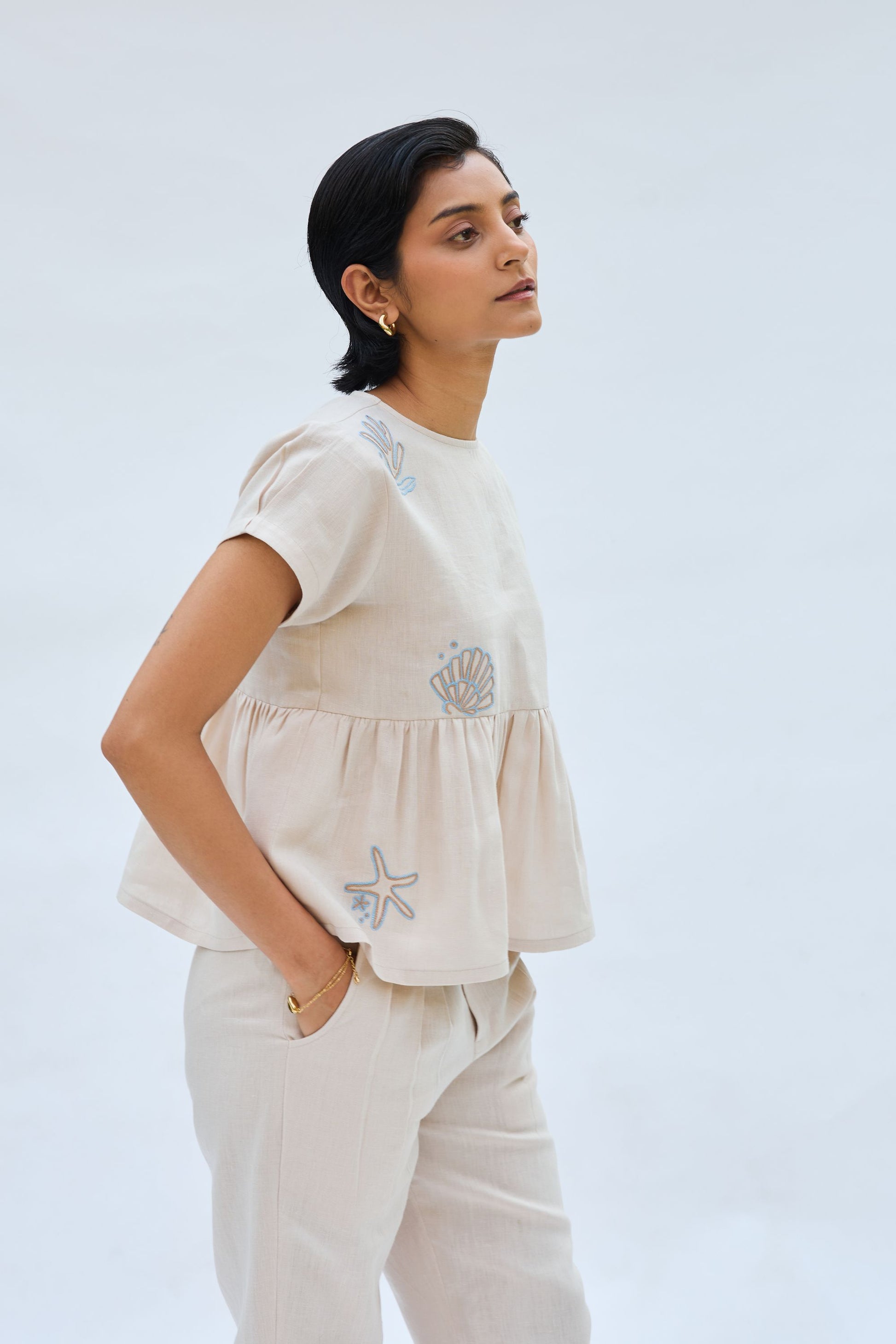 Regular fit, round-neck, sleeveless, peplum top crafted in azo-free dyed linen fabric, machine embroidered with ocean-inspired motifs.