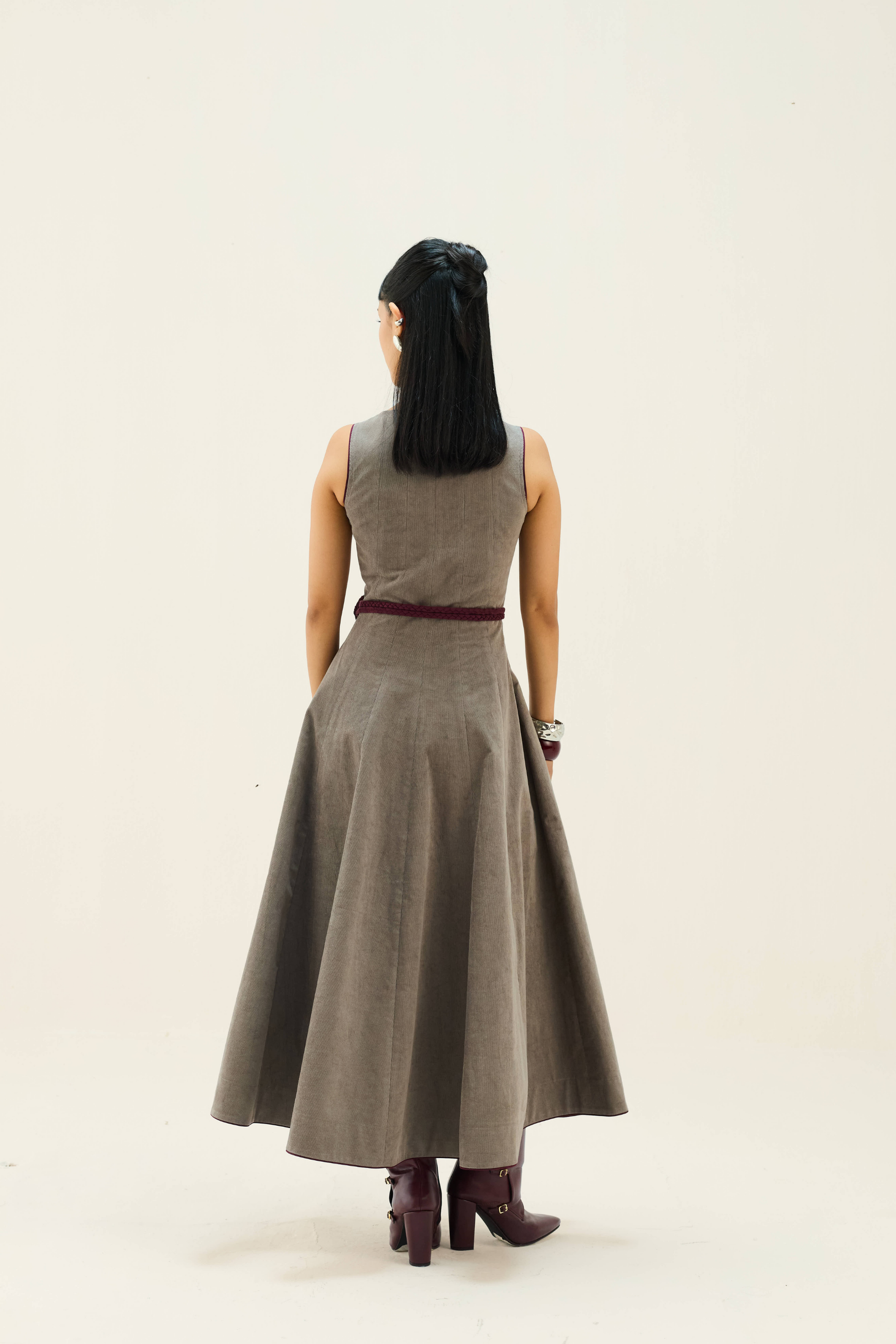 Fitted, strappy, round neck, a-line maxi dress crafted in azo-free dyed organic cotton corduroy fabric - comes with a fabric belt.