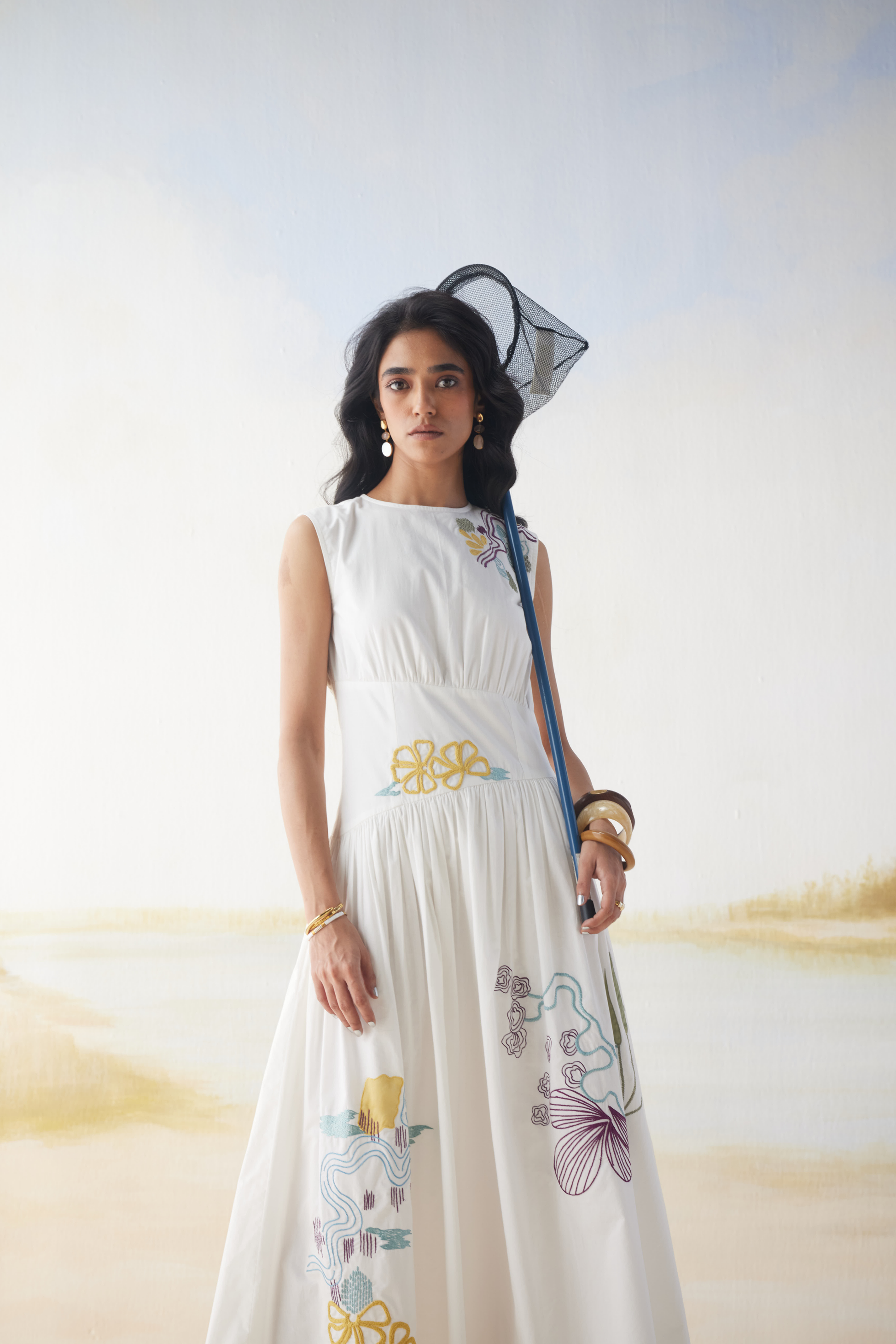 Fitted, sleeveless, round neck, a-line dress crafted in organic cotton poplin fabric, machine embroidered with shore-inspired motifs.