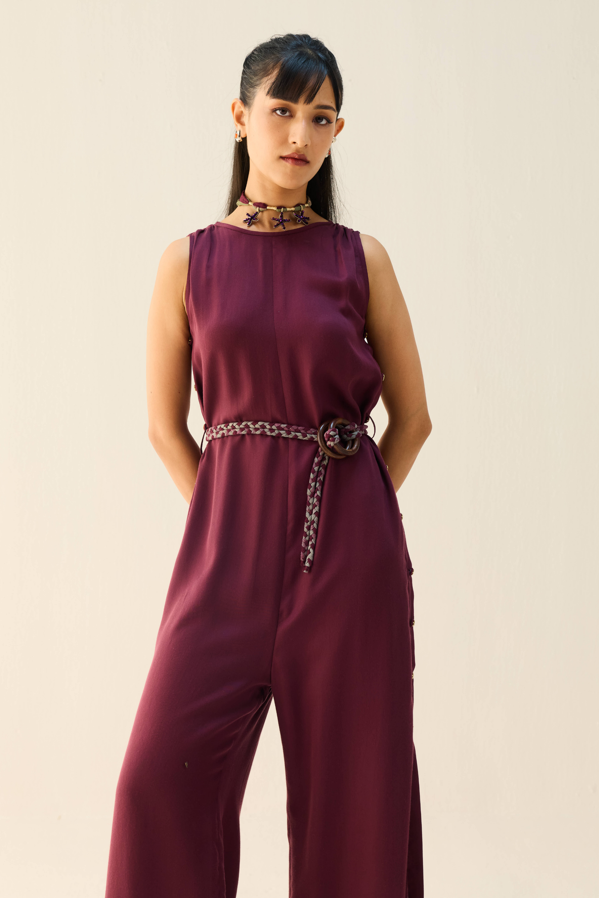 Fitted, sleeveless, full length jumpsuit crafted in azo-free dyed Tencel fabric, hand embroidered with nature-inspired motifs.