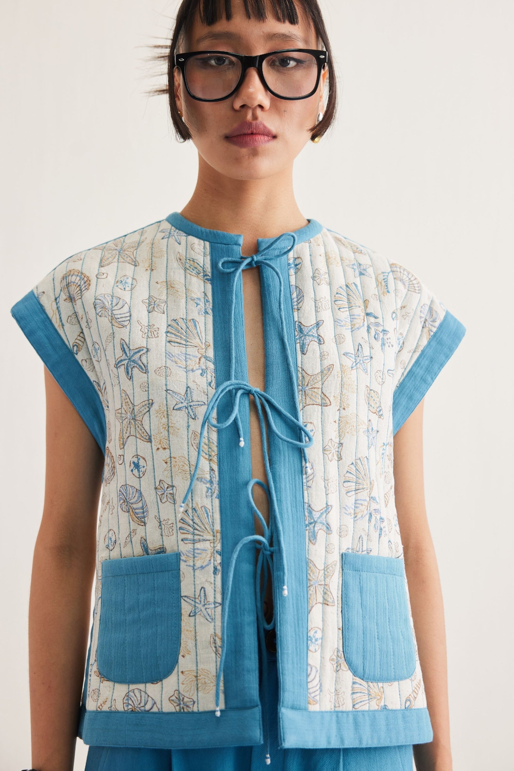 Regular fit, short sleeve, reversible vest top with pockets that fastens at the front with drawstrings, crafted in two fabrics - one is a blue azo-free dyed double gauze organic cotton, the other is a handspun and handwoven Kala cotton fabric that's hand block printed with our signature ocean life inspired motif using azo-free dyes.